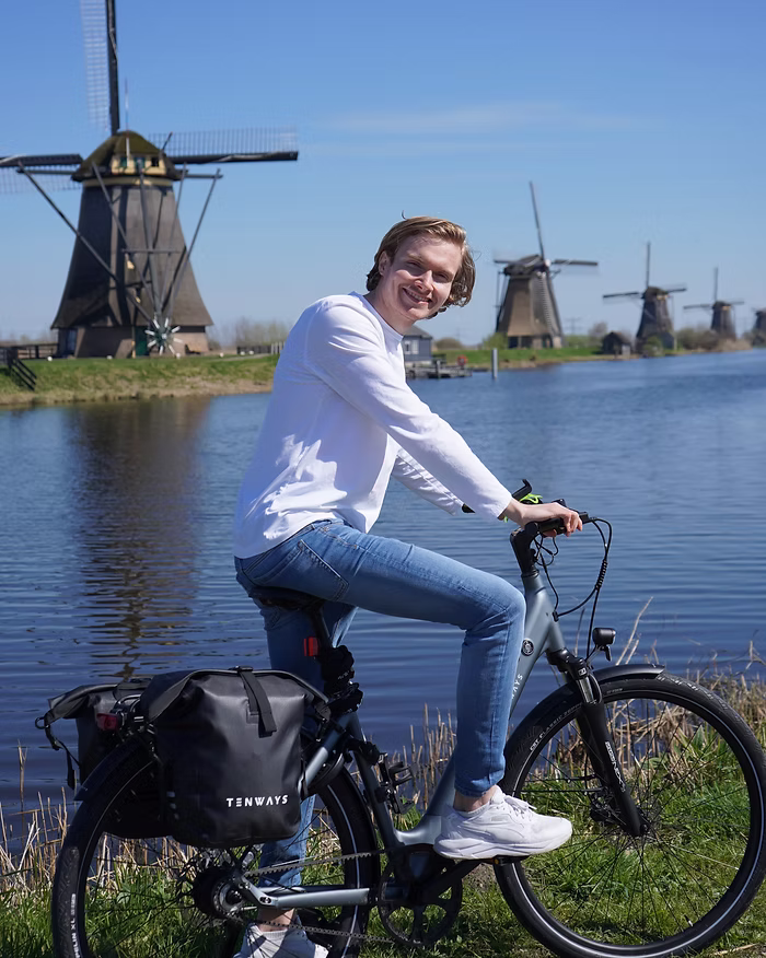 Thanks to our friends at Tenways E-bike, we were able to each pick up in Amsterdam our new CGO800S model bikes, designed for commutes, cycle trails, and—in our case—cross-country bike-packing trips feeling comfortable, safe, and smooth. As Londoners, we were used to picking up pay-as-you-go bikes that can be left across the city, but have often questionable mileage and sometimes shockingly poor suspension. After our first ride on our Tenways bikes through the busy cycle lanes of Amsterdam, the wide wheels, comfortable seat, back rack, waterproof panniers, excellent suspension, removable and rechargeable battery, and five-level electric bike boost, we were in love!