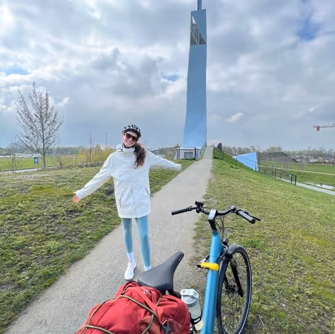 We set off from Conscious Hotels Westerpark at 10am, after a good-night’s sleep and a filling breakfast. Having fit all of our stuff into just one backpack and two large panniers (or saddlebags) each, we were surprised by how well the bike supported the weight, how secure our bags felt on the back, and just how easy it was for us to pedal with the cycle assist only on level one! We used two bungee cords each to secure our backpacks to the back rack, and we’ve included a full packing list below for a full listing of everything we brought on the trip!